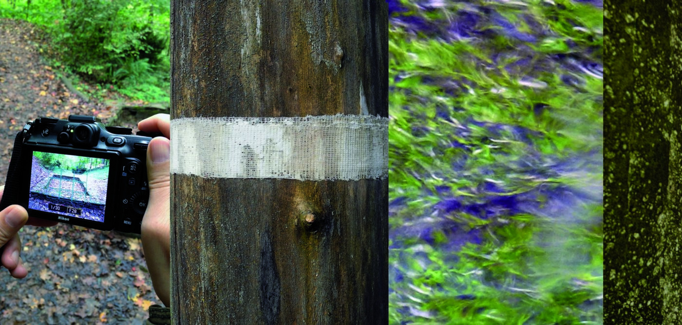Wie überall, so ist auch auf dem March-Hügel, meinem Austragungsort für „vorort“, Werden und Vergehen nah beieinander. Die toten Bäume fallen auf den ersten Blick nicht auf, erst wenn man den Kopf hebt und die kahlen Äste sieht, weiß man: Hier ist kein Leben mehr. Diese Bäume, die den Nährstoff für die neuen Keimlinge bilden, sobald sie ganz zu verrotten beginnen, salbe ich mit einer Gipsbinde und mache sie so sichtbar.